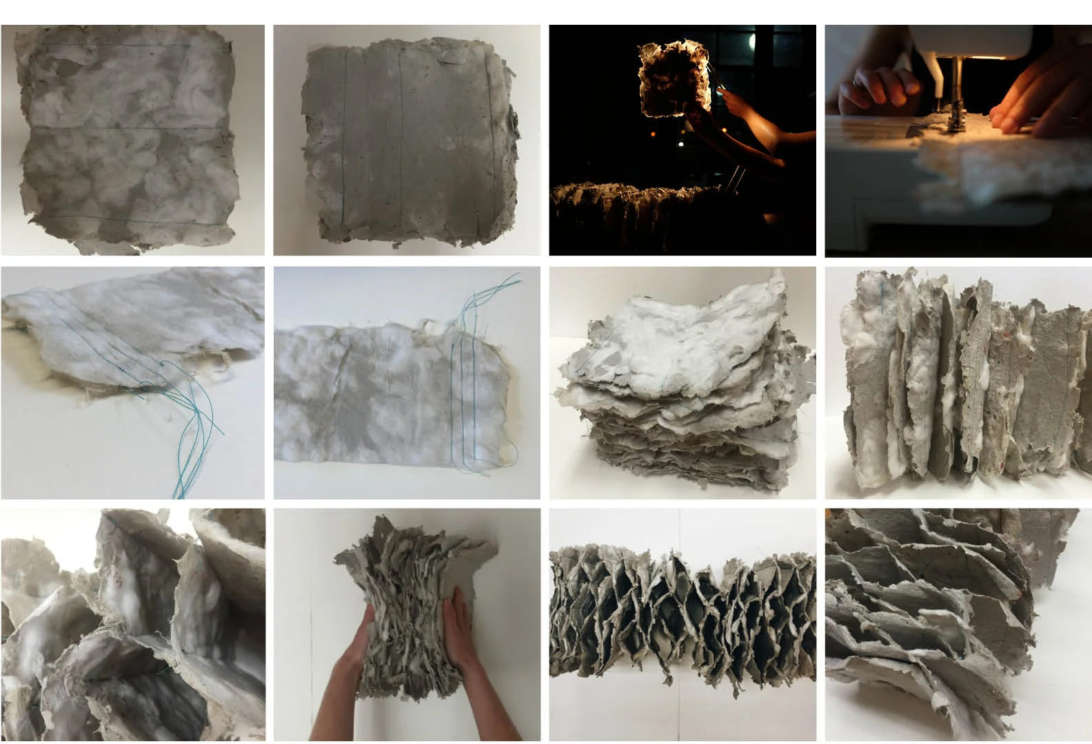To better understand the potential for this product, we undertook a series of studies using additives as variables. Each prototype tested a cotton-to-paper ratio and in some studies we introduced additional material variables into the mixture. Our first iteration included a shredded cotton t-shirt mixed with used white Strathmore and used printer paper. Realizing we had limited resources to continue shredding fabric, our next set of studies tested a series of cotton and old newspaper mixtures, using ratios as variables. To create a constant we first produced a 100% old newspaper prototype and a 100% cotton prototype separately, using the same papermaking process as before. The 100% cotton prototype was fragile and fell apart easily because there was nothing in the mixture to bind it together. The 100% newspaper prototype, however, held together due to the cellulose already present within the material. We then combined the two raw materials into one prototype, varying their percentages. We found that the prototype which used an equal amount of newspaper and cotton was the most successful. We then used that recipe to introduce a new variable, Rockite, into the mixture. Although Rockite gave the prototypes compressive strength, naturally, we realized this introduction would prevent us from eventually sewing our prototypes into a module, which was an important part of our material determination process. Lastly, we collected lint and attempted to produce a 50% cotton, 50% lint prototype. This study fell apart easily like the 100% cotton prototype due to the lack of a structural or binding component.