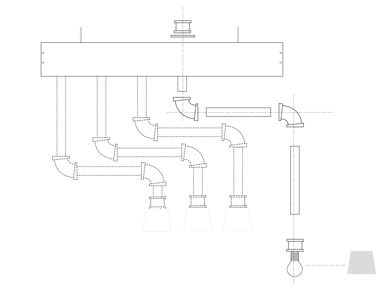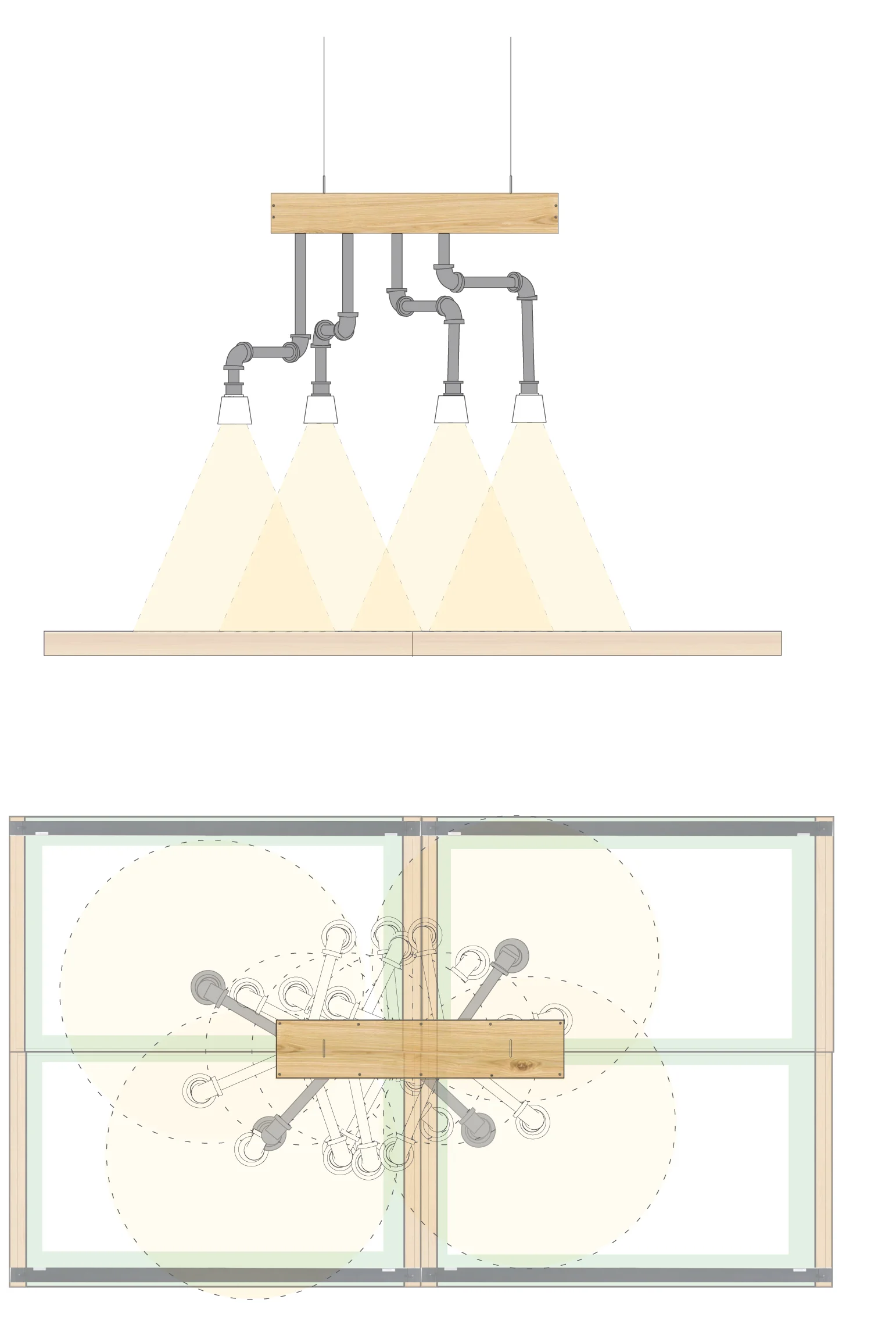Röhrenlicht is a design solution that could supply adequate task light for multiple students, while still allowing for versatility and personalization, as every designer’s needs are different. Röhrenlicht is a suspended fixture comprised of a wooden rectangular box through which 4 metal pipes are threaded. The pipes are configured in such a way that when rotated, they do not interfere with one another. The wiring required to light the bulb is threaded through the metal piping and reaches the power supply through an outlet hole in the wooden box. The parts are easily collapsible and foldable in order for students to pack it up and transport the fixture from studio to studio. This fixture supplies reachable task lighting for 2-4 desks through the use of rotating pipes. The goal was to create a versatile, compact, and unobtrusive luminaire that provides task- oriented light supply.