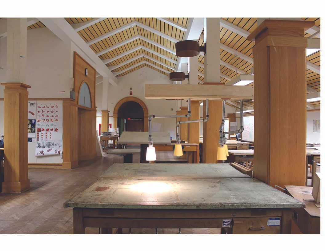 The attic of Sutton Hall, a building of the UT School of Architecture, serves as a studio space for both first years and graduate students. The space is very dim, even during the day. The current light fixtures and window apertures do not provide adequate lighting for the studio space. Currently the attic hosts 18 suspended fluorescent rod fixtures, and 6 uplighting sconses at each column supporting the roof. In addition, there are 14 clerestory windows lining the North side of the room. The room itself has great potential to be a productive space, but its insufficient lighting makes the room feel abandoned and uncomfortable.